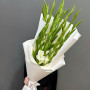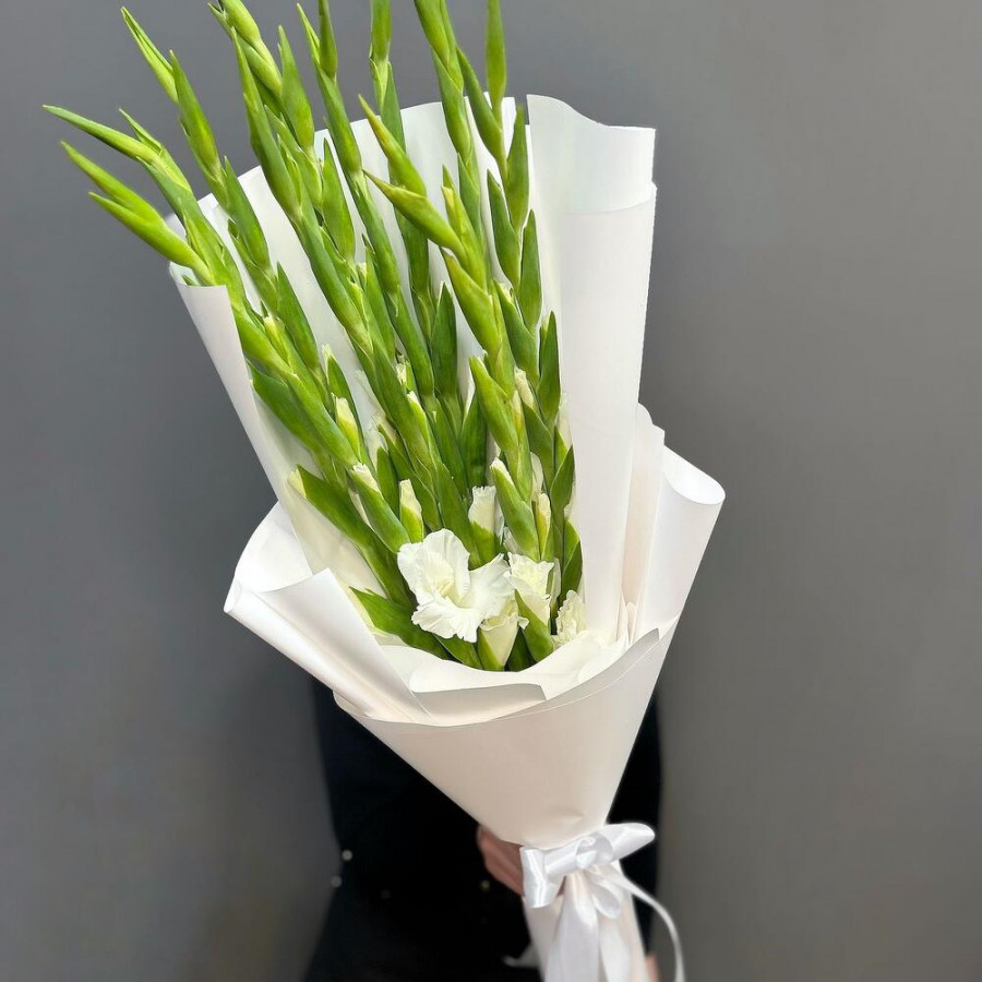 На фото букет из 11 белых гладиолусов. В составе: гладиолус 11 шт, дизайнерская упаковка 1 шт, . Все цветы свежие и ароматные, букет красиво оформлен и отлично подходит для подарка. Доступна доставка цветов или самовывоз.