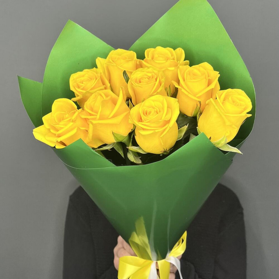 На фото букет из 9 желтых роз. В составе: роза 9 шт, дизайнерская упаковка 1 шт, атласная лента 1 шт, . Все цветы свежие и ароматные, букет красиво оформлен и отлично подходит для подарка. Доступна доставка цветов или самовывоз.