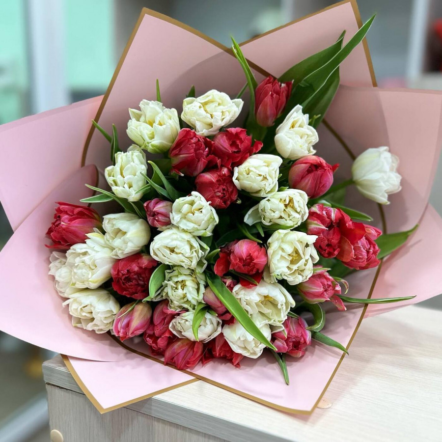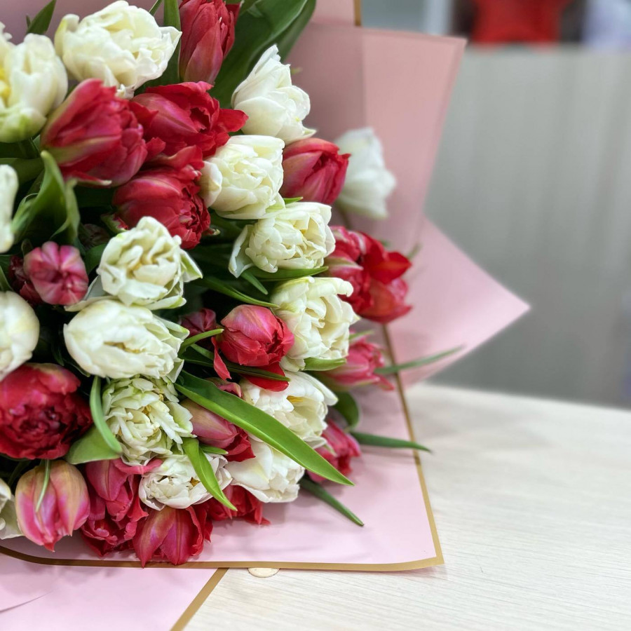 На фото букет из 31 белого и красного тюльпана. В составе: тюльпан 31 шт, крафт-бумага 1 шт, атласная лента 1 шт, . Все цветы свежие и ароматные, букет красиво оформлен и отлично подходит для подарка. Доступна доставка цветов или самовывоз.