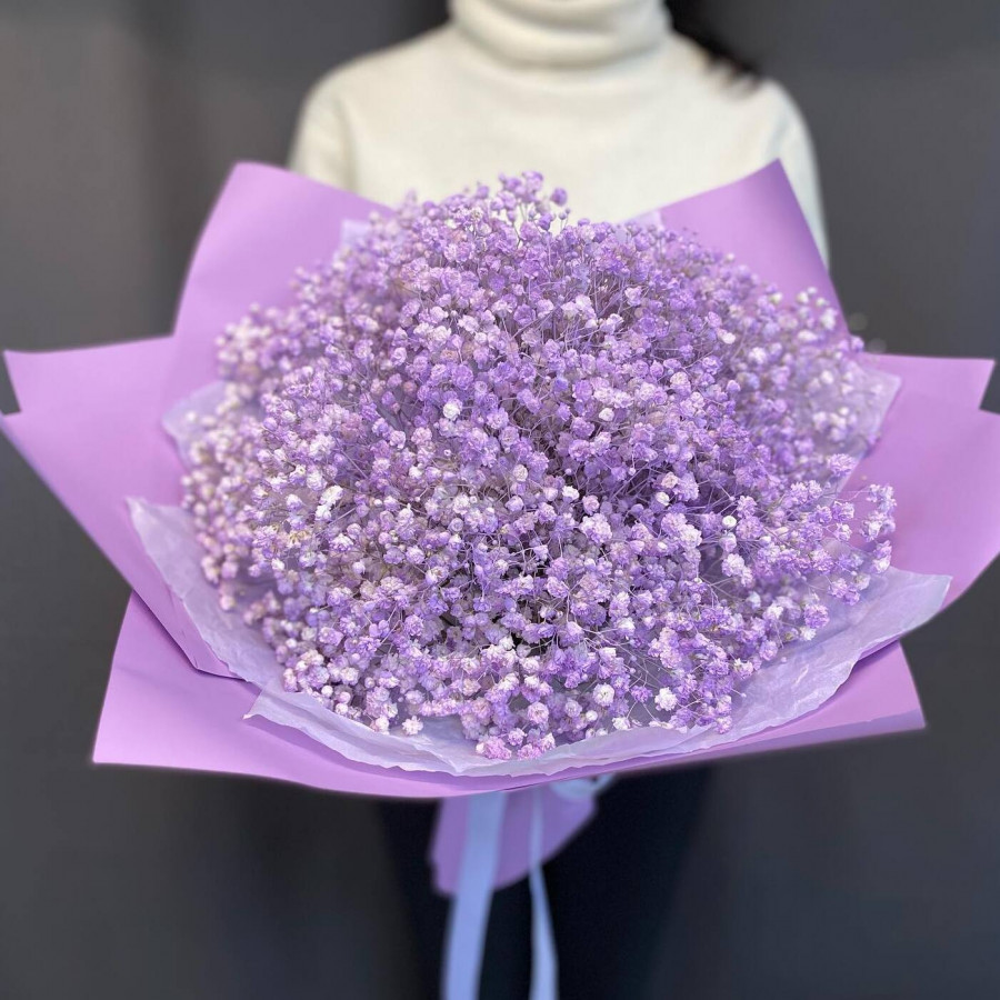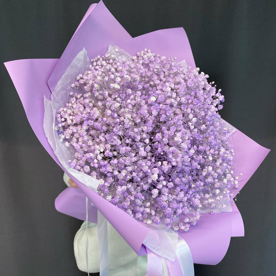 На фото букет из сиреневой гипсофилы. В составе: гипсофила 13 шт, крафт-бумага 1 шт, . Все цветы свежие и ароматные, букет красиво оформлен и отлично подходит для подарка. Доступна доставка цветов или самовывоз.